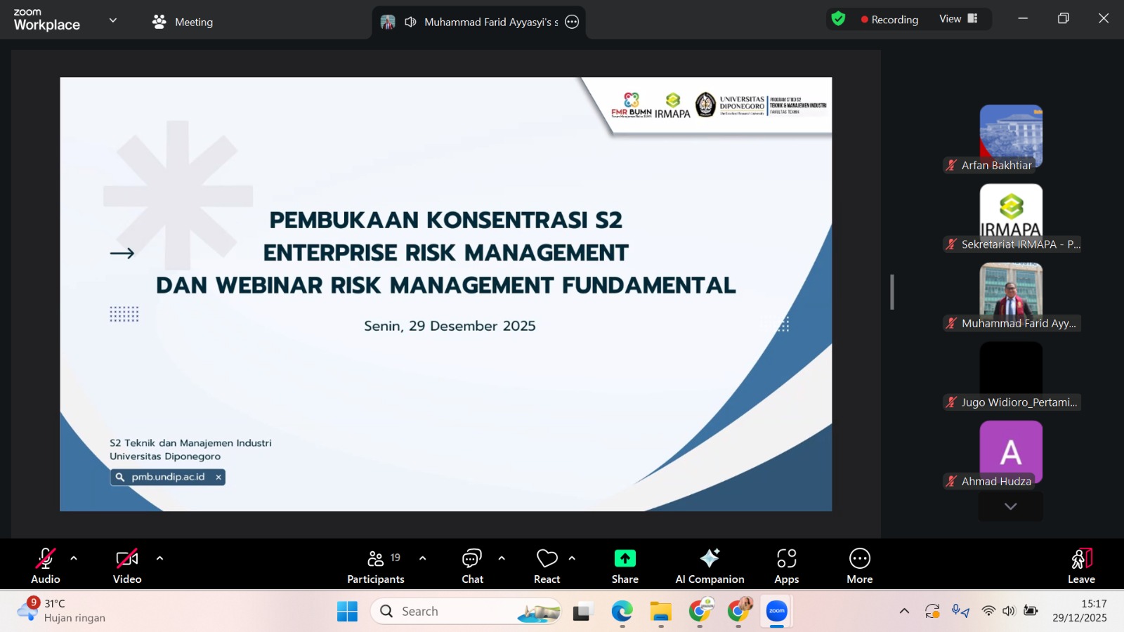 Pada Senin, 29 Desember 2025, Pembukaan Konsentrasi S-2 Enterprise Risk Management (ERM) Departemen Teknik Industri Universitas Diponegoro (Undip) serta Webinar S-2 Teknik dan Manajemen Industri diselenggarakan oleh Indonesia Risk Management Professional Association (IRMAPA) bersama Program Studi S-2 Teknik dan Manajemen Industri Undip.